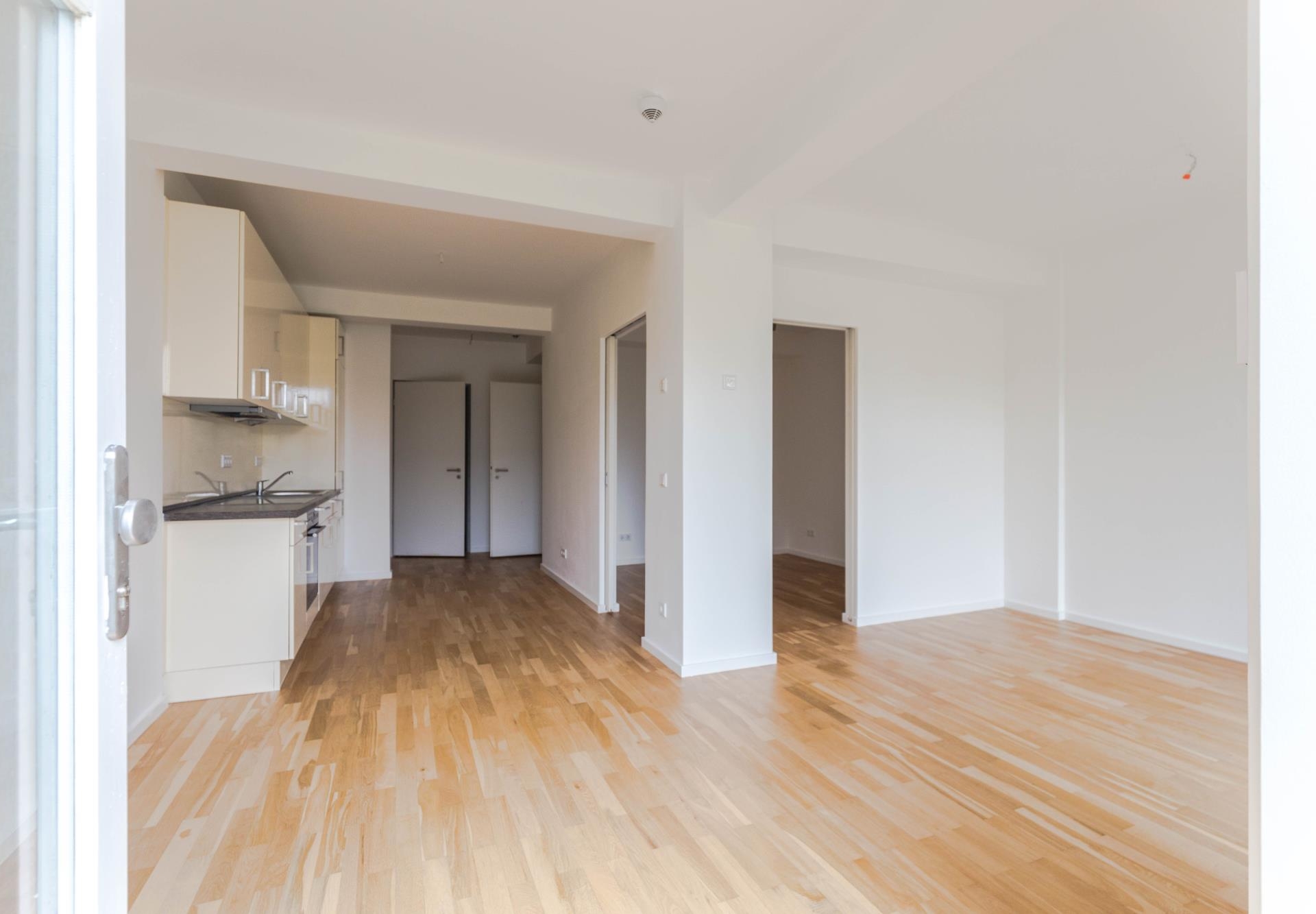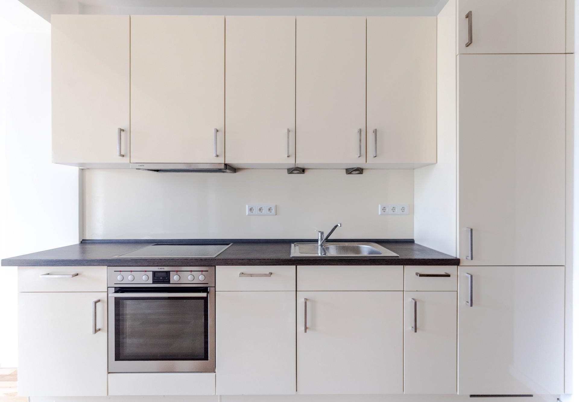Die offenen Wohn- und Essbereiche sind jeweils mit einer modernen Einbauküche ausgestattet. In den geräumigen Bädern, teilweise mit Badewanne, setzen große Fliesen, verchromte Armaturen und Deckenspots stilvolle Designakzente.