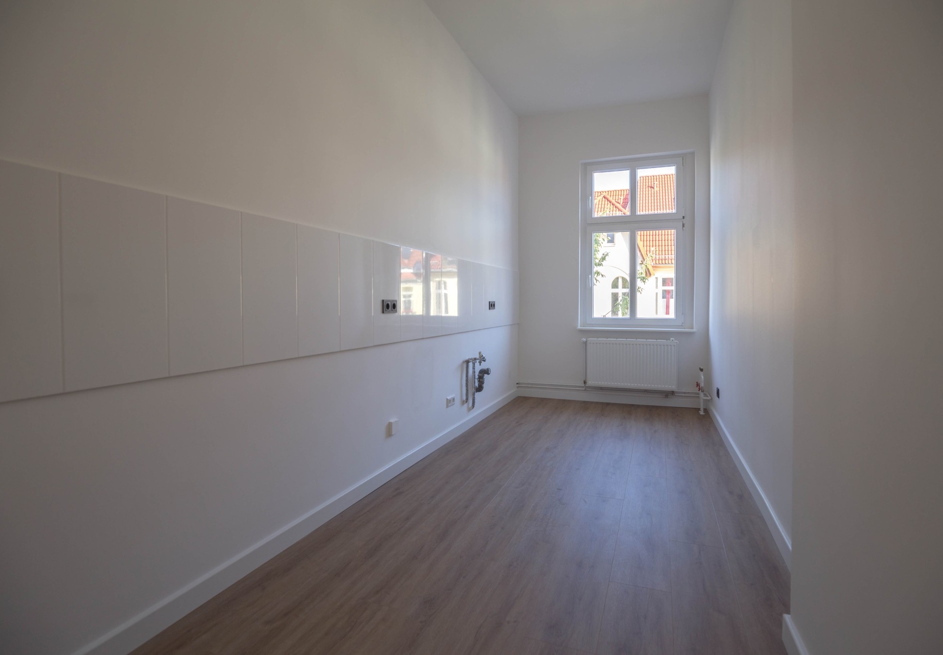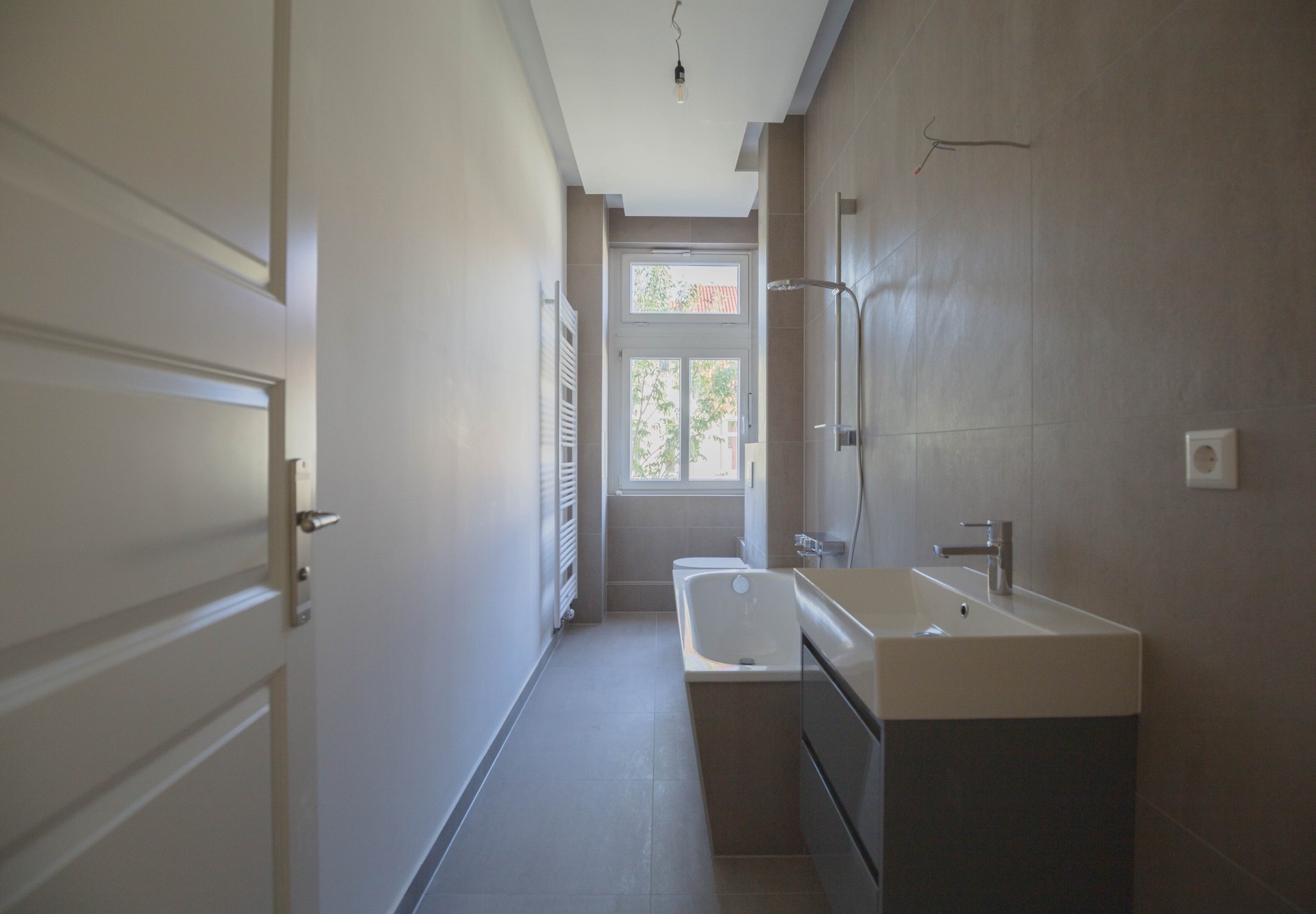 Die separate Küche ermöglicht komfortables Kochen abseits des Wohnbereichs. Das Badezimmer ist modern gefliest und fügt sich stilvoll in das Gesamtbild der Wohnung ein. Es ist kein Aufzug vorhanden.