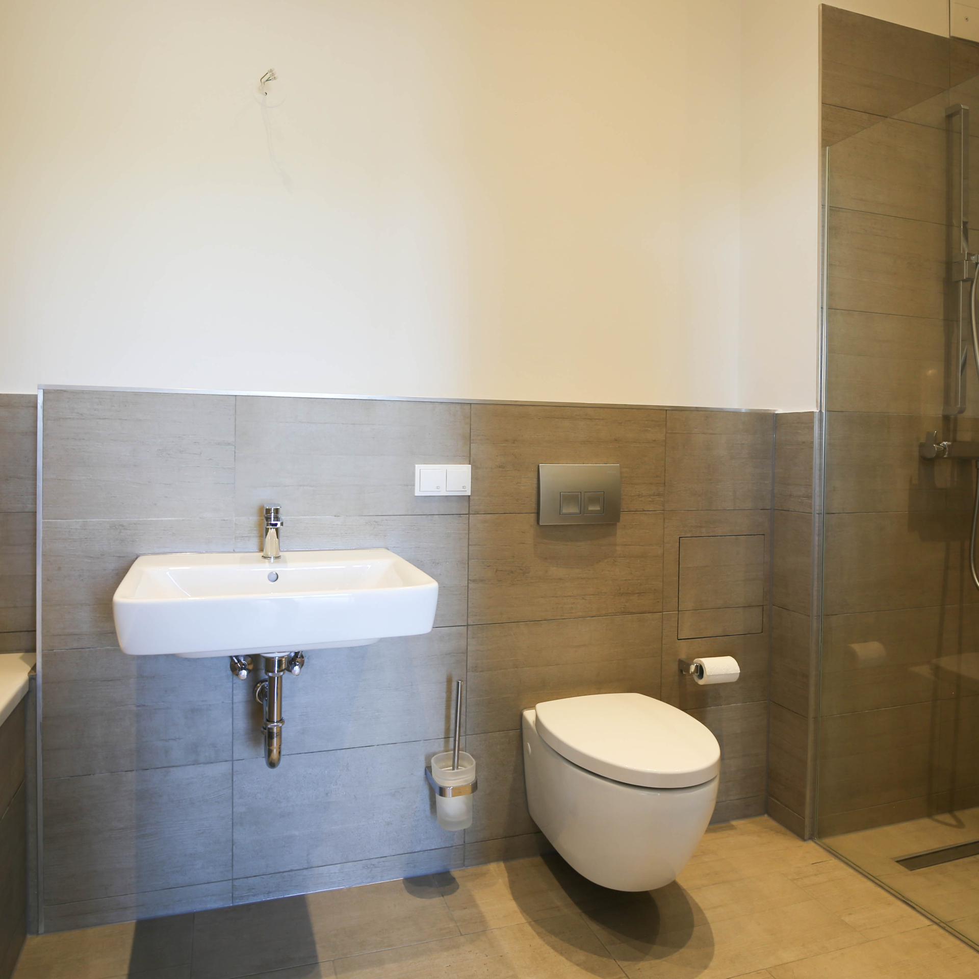 Die offenen Wohn- und Essbereiche sind jeweils mit einer modernen Einbauküche ausgestattet. In den geräumigen Bädern, teilweise mit Badewanne, setzen große Fliesen, verchromte Armaturen und Deckenspots stilvolle Designakzente.