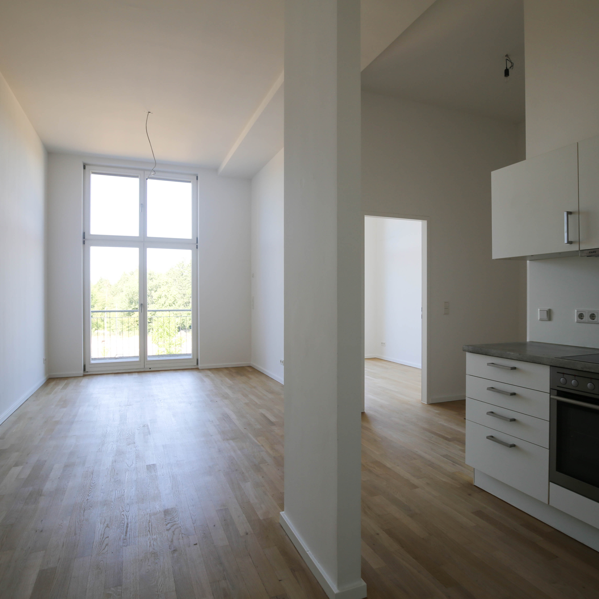 Lichte 3,5 Meter hohe Decken sorgen zusammen mit bodentiefen Fensterfronten für ein weitläufiges und helles Raumgefühl. Hochwertige Parkettböden und Fußbodenheizungen schaffen eine angenehme Wohnatmosphäre und ein optimales Raumklima.