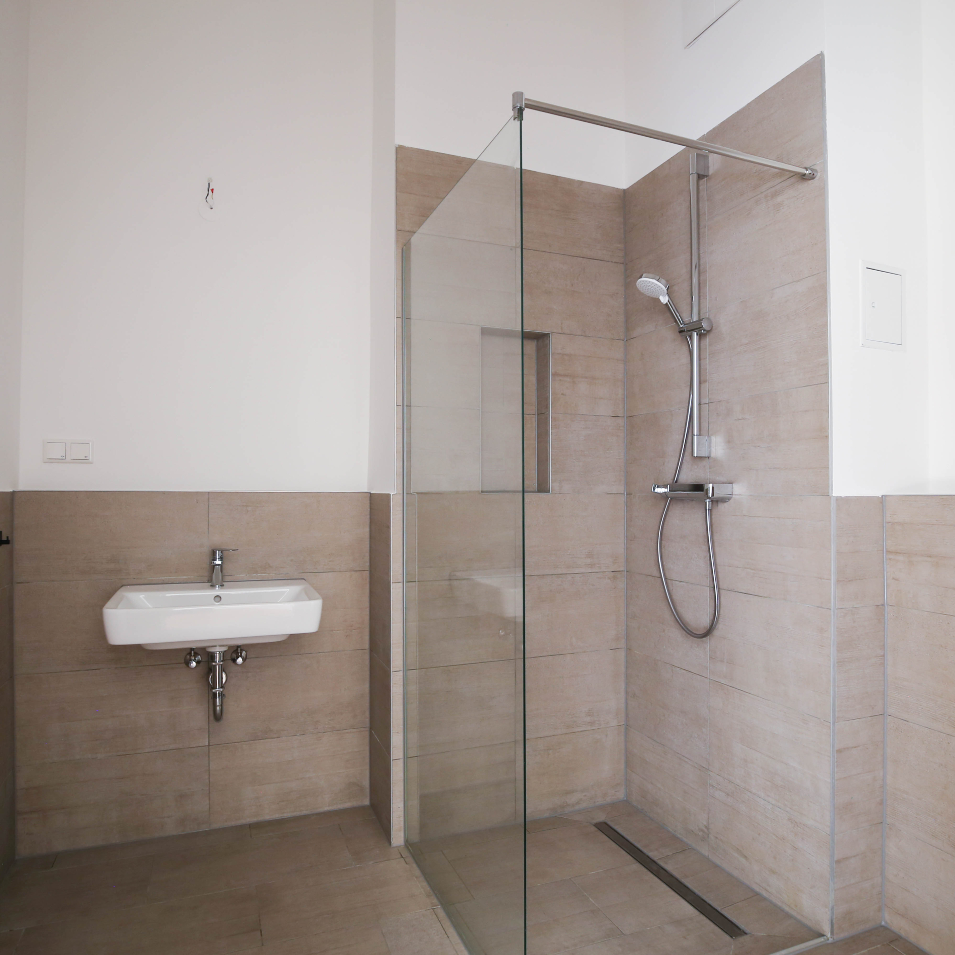 Die offenen Wohn- und Essbereiche sind jeweils mit einer modernen Einbauküche ausgestattet. In den geräumigen Bädern, teilweise mit Badewanne, setzen große Fliesen, verchromte Armaturen und Deckenspots stilvolle Designakzente.