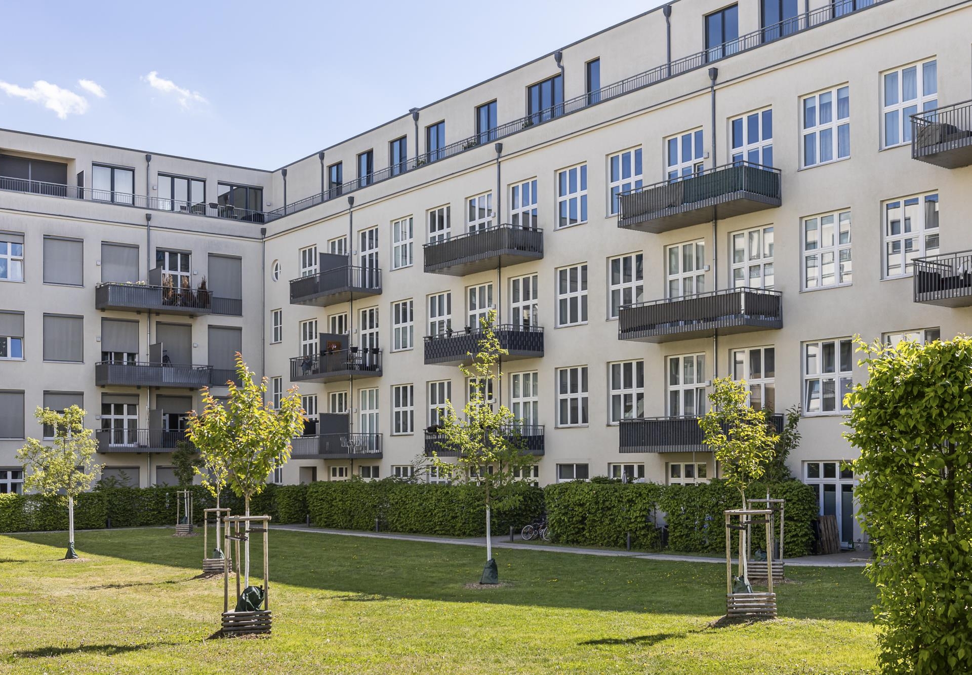 Die Treppenhäuser sind hell und funktional gestaltet und jeweils mit Fahrstühlen ausgestattet. Zudem stehen Tiefgaragen- sowie Außenstellplätze zur Verfügung.