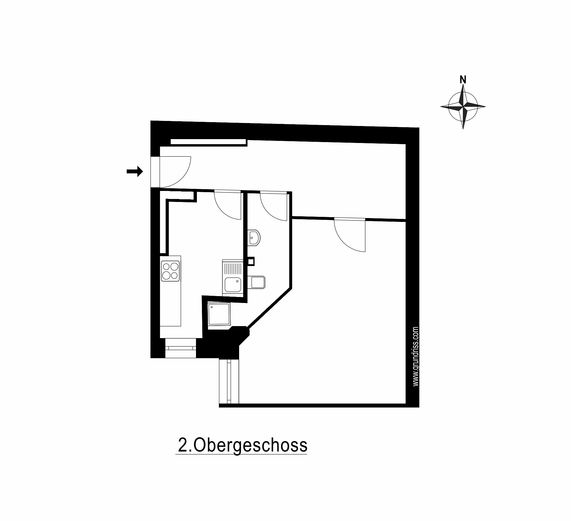Dieses gemütliche 1-Zimmer-Apartment im Seitenflügel bietet optimalen Wohnkomfort. Der Wohnbereich ist mit einem dunklen Laminatboden ausgestattet, der dem Raum eine moderne und einladende Atmosphäre verleiht.