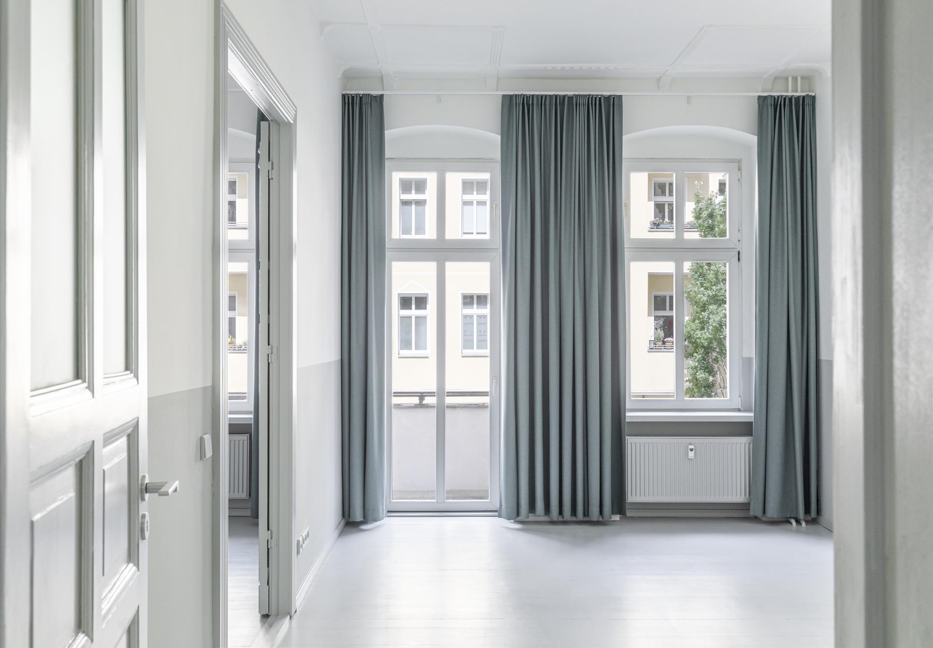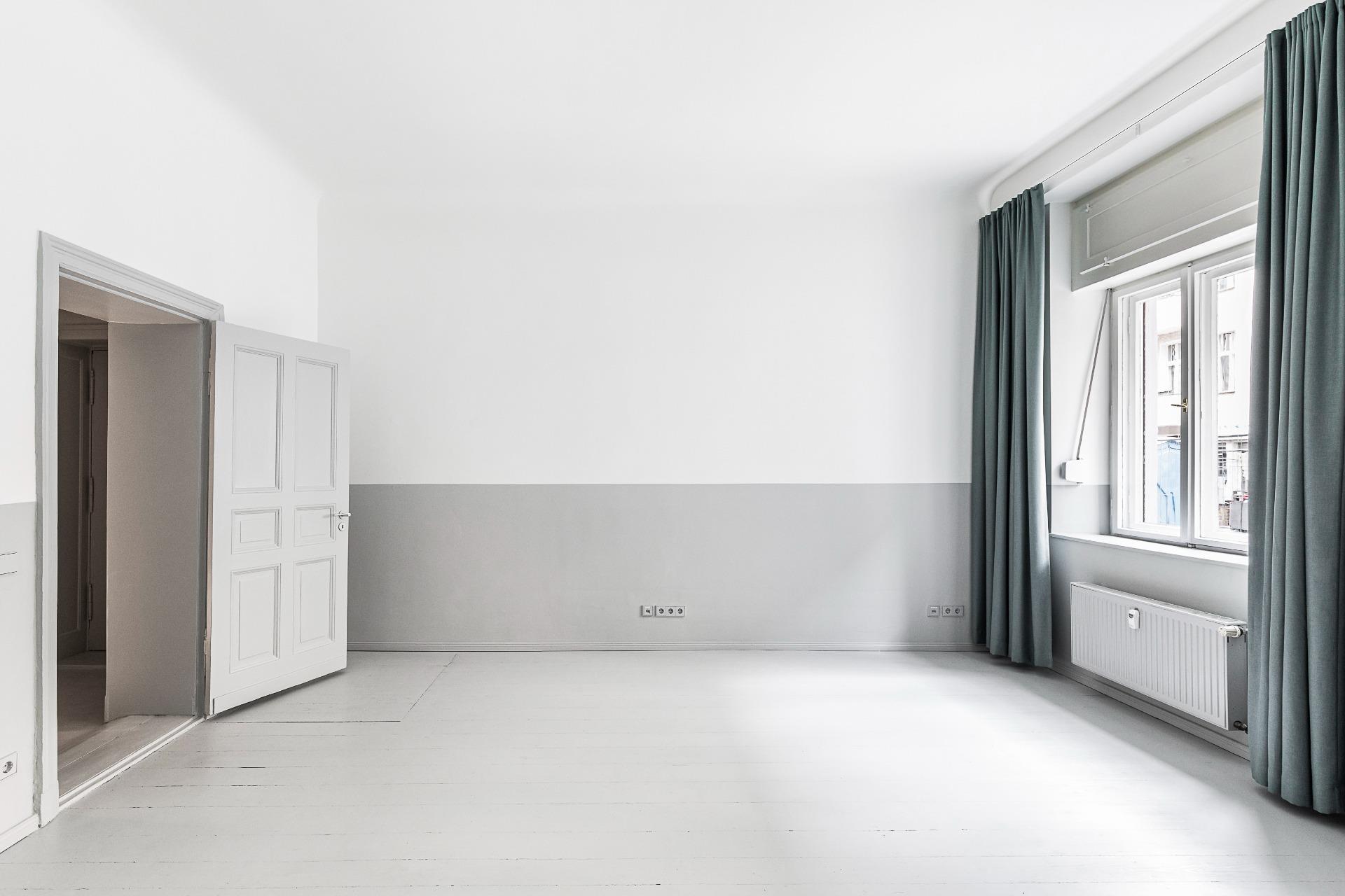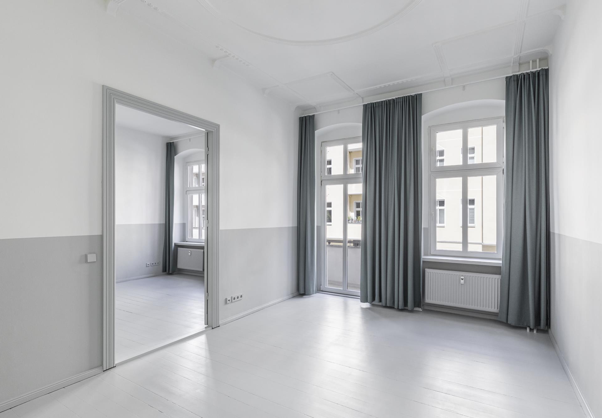 Zahlreiche Altbau-Elemente wie lichte Deckenhöhen, Stuckdetails, Doppelkastenfenster und Kassettentüren unterstreichen das besondere Ambiente. Ein moderner skandinavischer Akzent entsteht durch die hellgrauen Dielenböden, die harmonisch mit den zweifarbig gespachtelten Wänden kombiniert sind.