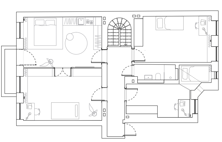 Die Treppenanlage zur ersten Etage ist ein echtes Highlight: gebogene Wandpaneele kontrastieren mit einem geradlinigen Stufendesign und werden von effektvoll platzierten Deckenspots inszeniert. Im privaten oberen Bereich der Maisonette stehen vier Zimmer sowie ein weiteres Badezimmer zur Verfügung – ideal als Schlaf-, Kinder-, Gäste- oder Arbeitszimmer.