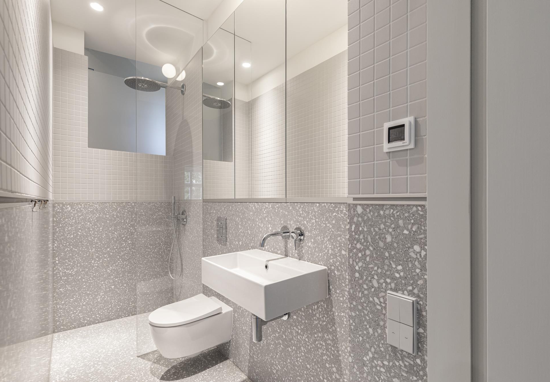 Im Erdgeschoss bilden das Wohnzimmer und ein angrenzender Wohnraum den räumlichen Mittelpunkt. Die maßgefertigte Wohnküche mit bodentiefen Fenstern eröffnet den Blick in den begrünten Innenhof und bietet einen direkten Zugang zu einem privaten Außenbereich. Ein hochwertig ausgestattetes Badezimmer mit Badewanne und separater Dusche sowie ein durchdachter Hauswirtschaftsraum komplettieren das Raumkonzept der unteren Ebene.