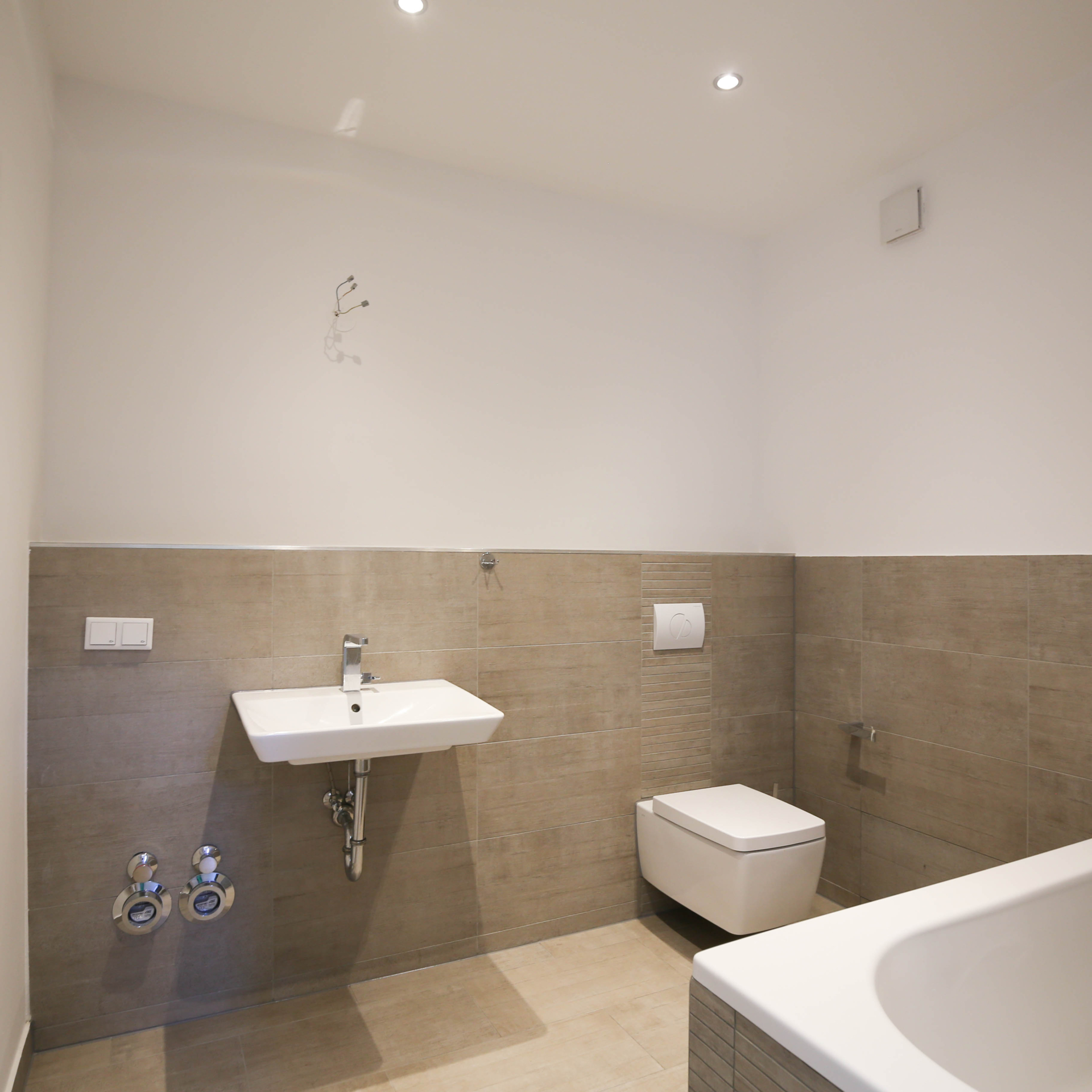 Die offenen Wohn- und Essbereiche sind jeweils mit einer modernen Einbauküche ausgestattet. In den geräumigen Bädern, teilweise mit Badewanne, setzen große Fliesen, verchromte Armaturen und Deckenspots stilvolle Designakzente.