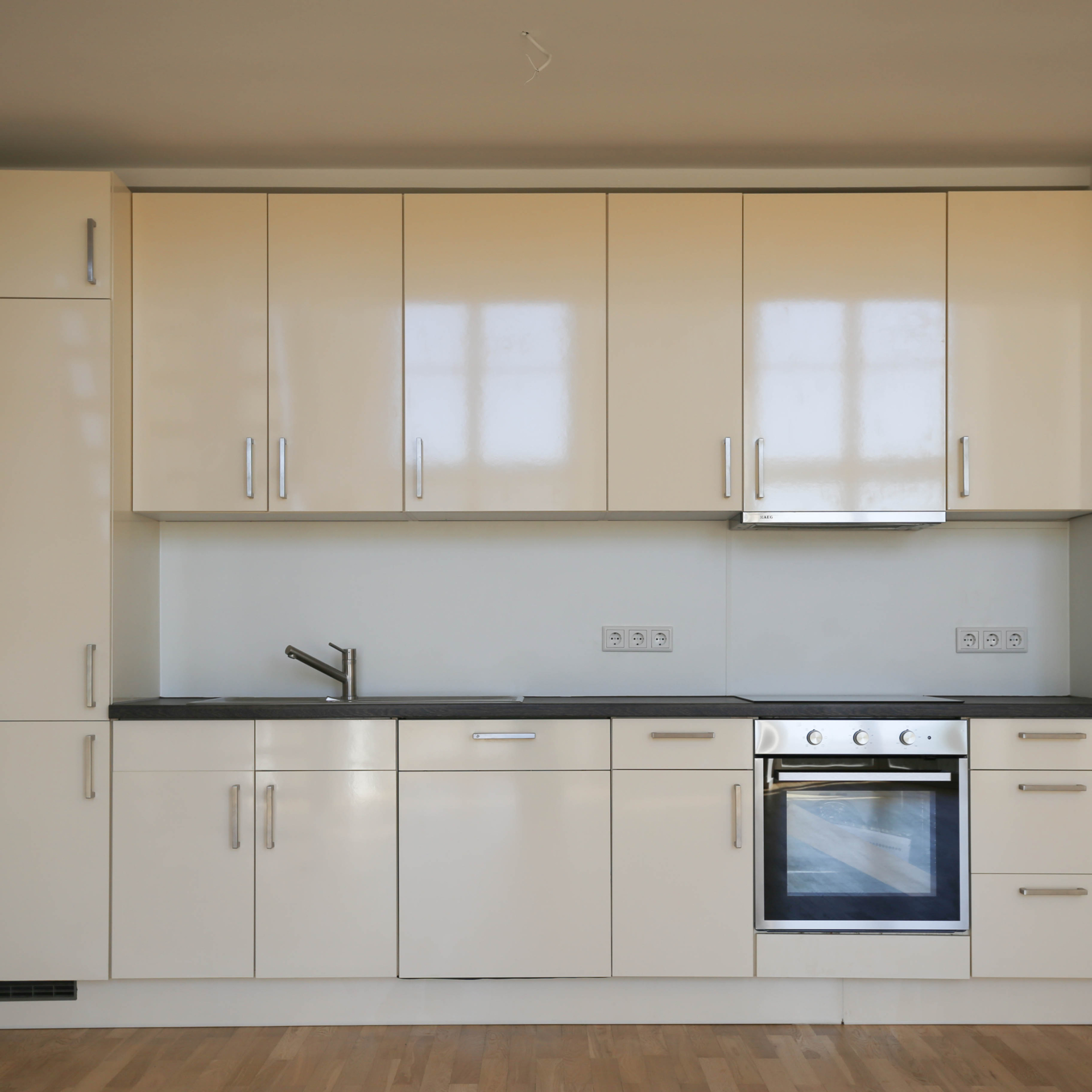 Die offenen Wohn- und Essbereiche sind jeweils mit einer modernen Einbauküche ausgestattet. In den geräumigen Bädern, teilweise mit Badewanne, setzen große Fliesen, verchromte Armaturen und Deckenspots stilvolle Designakzente.