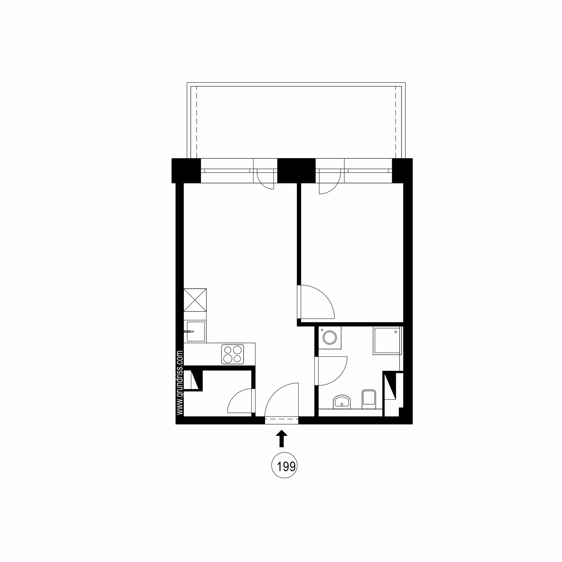 Die Wohnung verfügt über eine moderne Einbauküche, ein zeitgemäßes Bad sowie zwei helle Räume mit bodentiefen Fenstern, die für eine offene und lichtdurchflutete Atmosphäre sorgen.