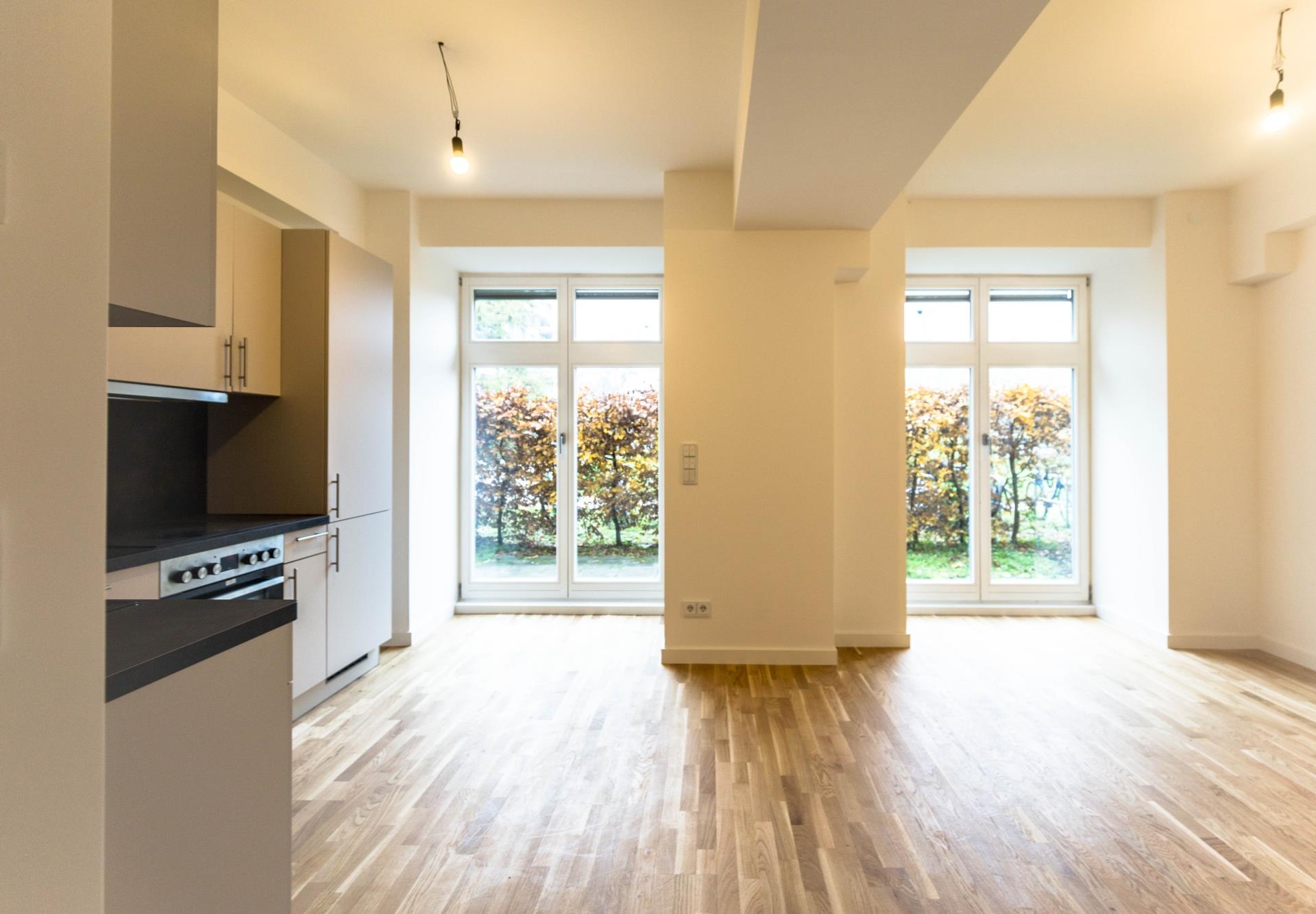 Lichte 3,5 Meter hohe Decken sorgen zusammen mit bodentiefen Fensterfronten für ein weitläufiges und helles Raumgefühl. Hochwertige Parkettböden und Fußbodenheizungen schaffen eine angenehme Wohnatmosphäre und ein optimales Raumklima.