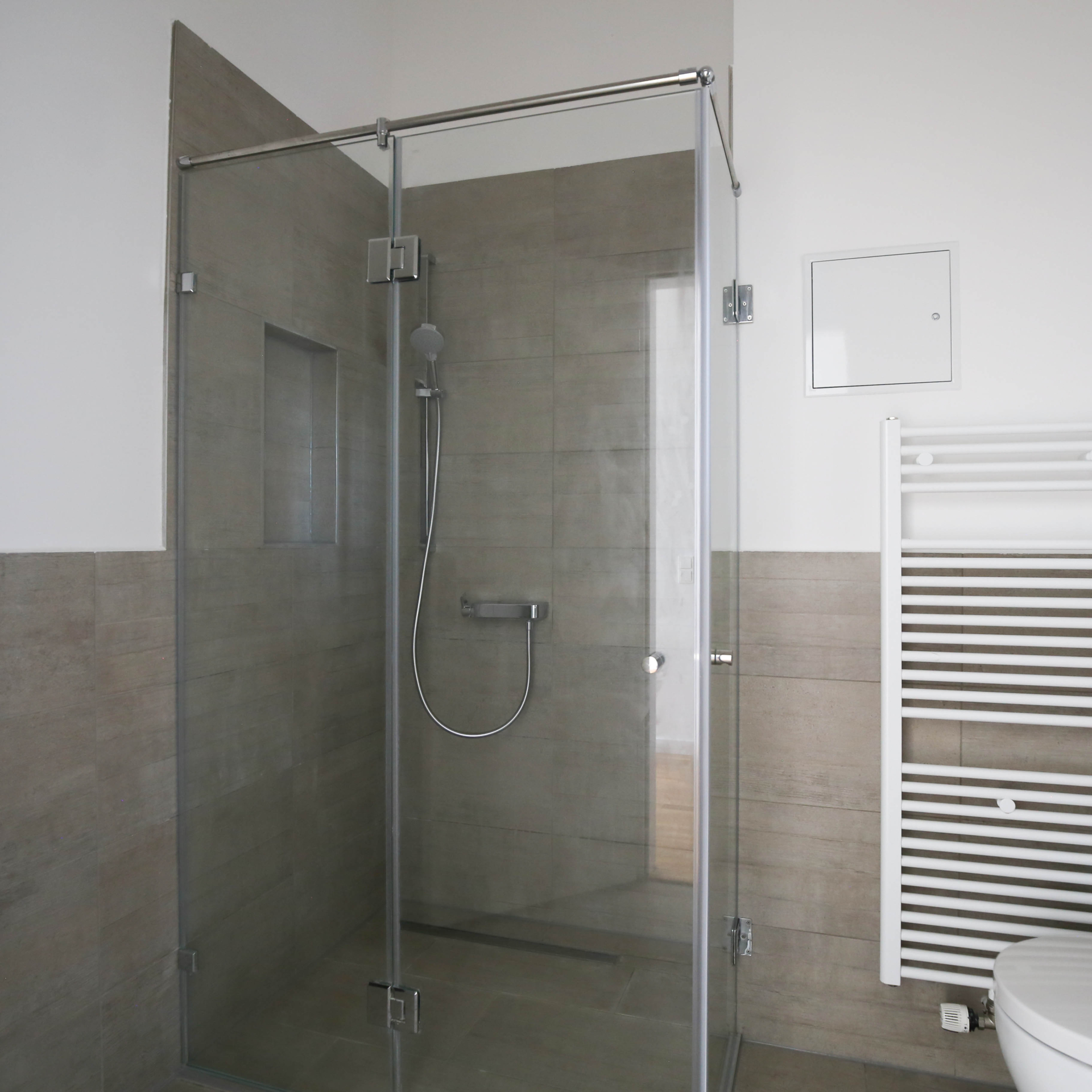 Die offenen Wohn- und Essbereiche sind jeweils mit einer modernen Einbauküche ausgestattet. In den geräumigen Bädern, teilweise mit Badewanne, setzen große Fliesen, verchromte Armaturen und Deckenspots stilvolle Designakzente.