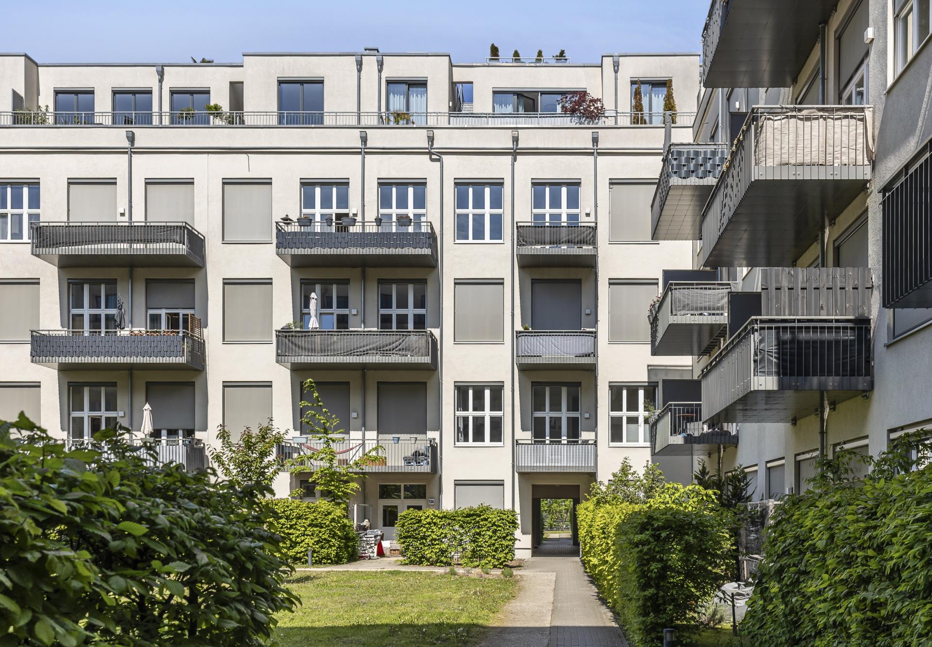 Die Treppenhäuser sind hell und funktional gestaltet und jeweils mit Fahrstühlen ausgestattet. Zudem stehen Tiefgaragen- sowie Außenstellplätze zur Verfügung.