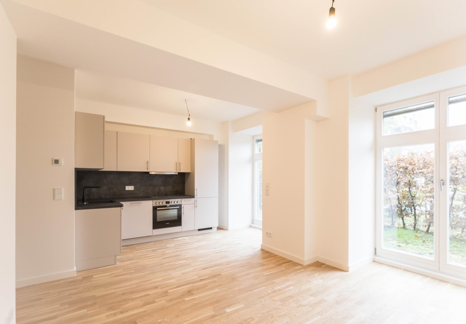 Lichte 3,5 Meter hohe Decken sorgen zusammen mit bodentiefen Fensterfronten für ein weitläufiges und helles Raumgefühl. Hochwertige Parkettböden und Fußbodenheizungen schaffen eine angenehme Wohnatmosphäre und ein optimales Raumklima.