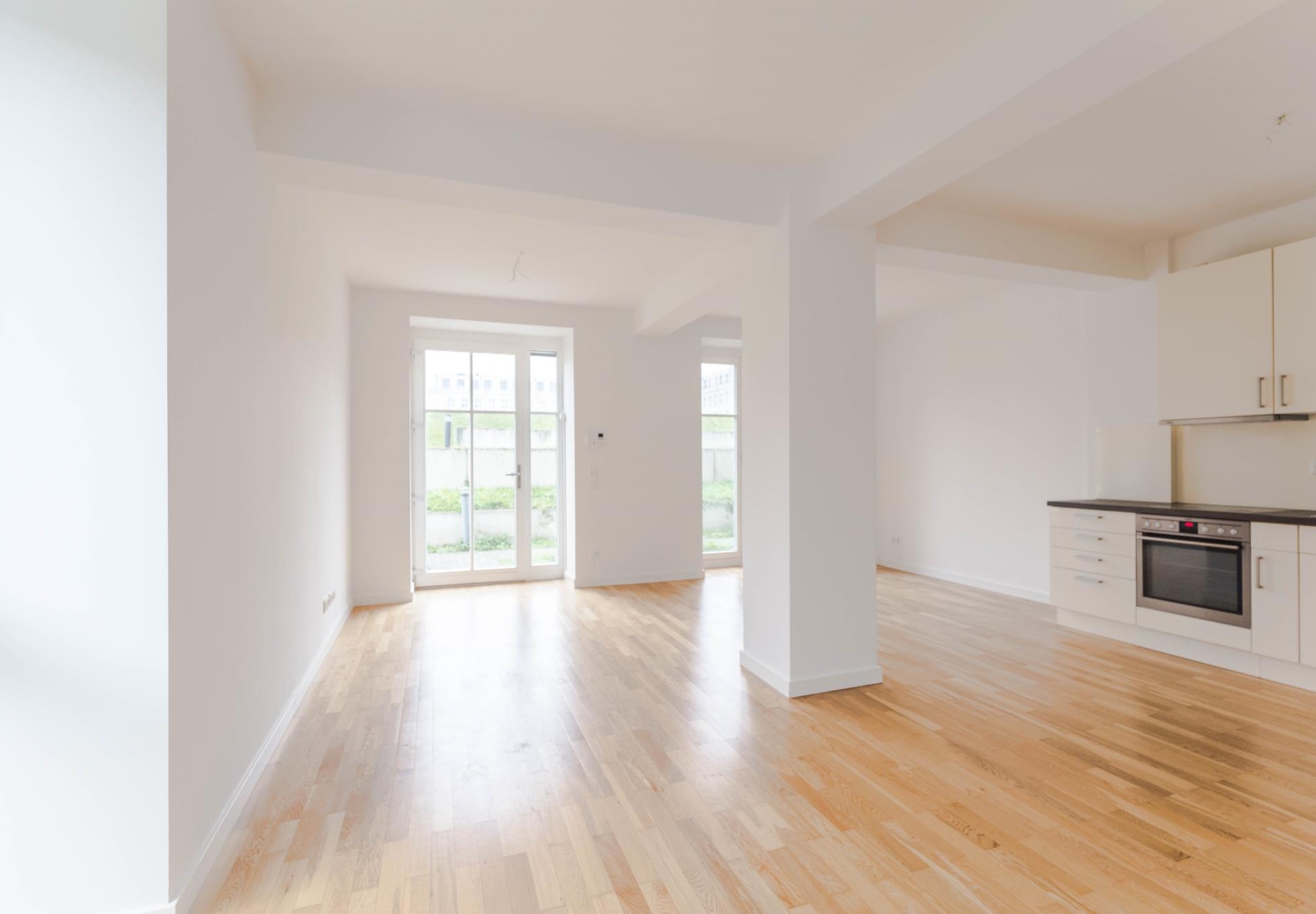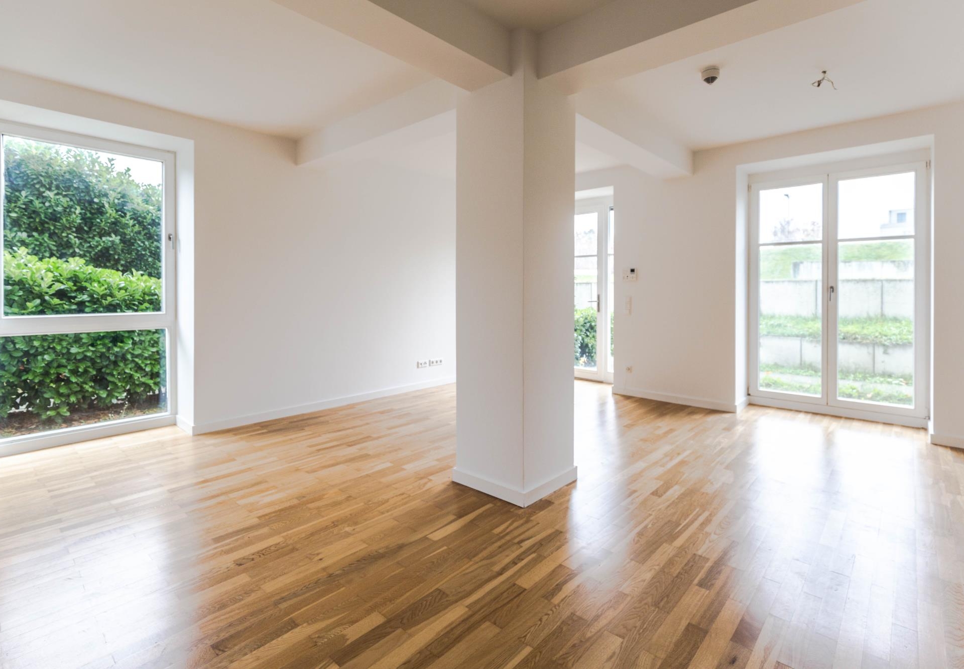 Lichte hohe Decken sorgen zusammen mit bodentiefen Fensterfronten für ein weitläufiges und helles Raumgefühl. Hochwertige Parkettböden und Fußbodenheizungen schaffen eine angenehme Wohnatmosphäre und ein optimales Raumklima.